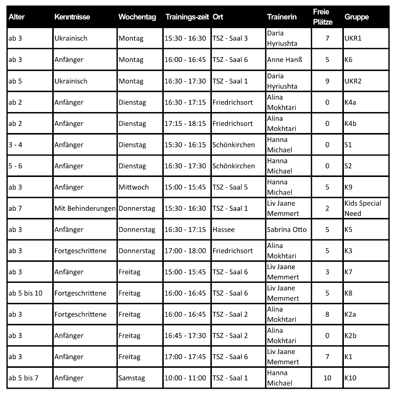 – In Friedrichsort kann das grundsätzlich ab etwa 2 Jahren probiert werden. In allen anderen Gruppen gilt ein Mindestalter von 3 Jahren. Bei den Big Kids ist das Mindestalter 5 Jahre erforderlich.